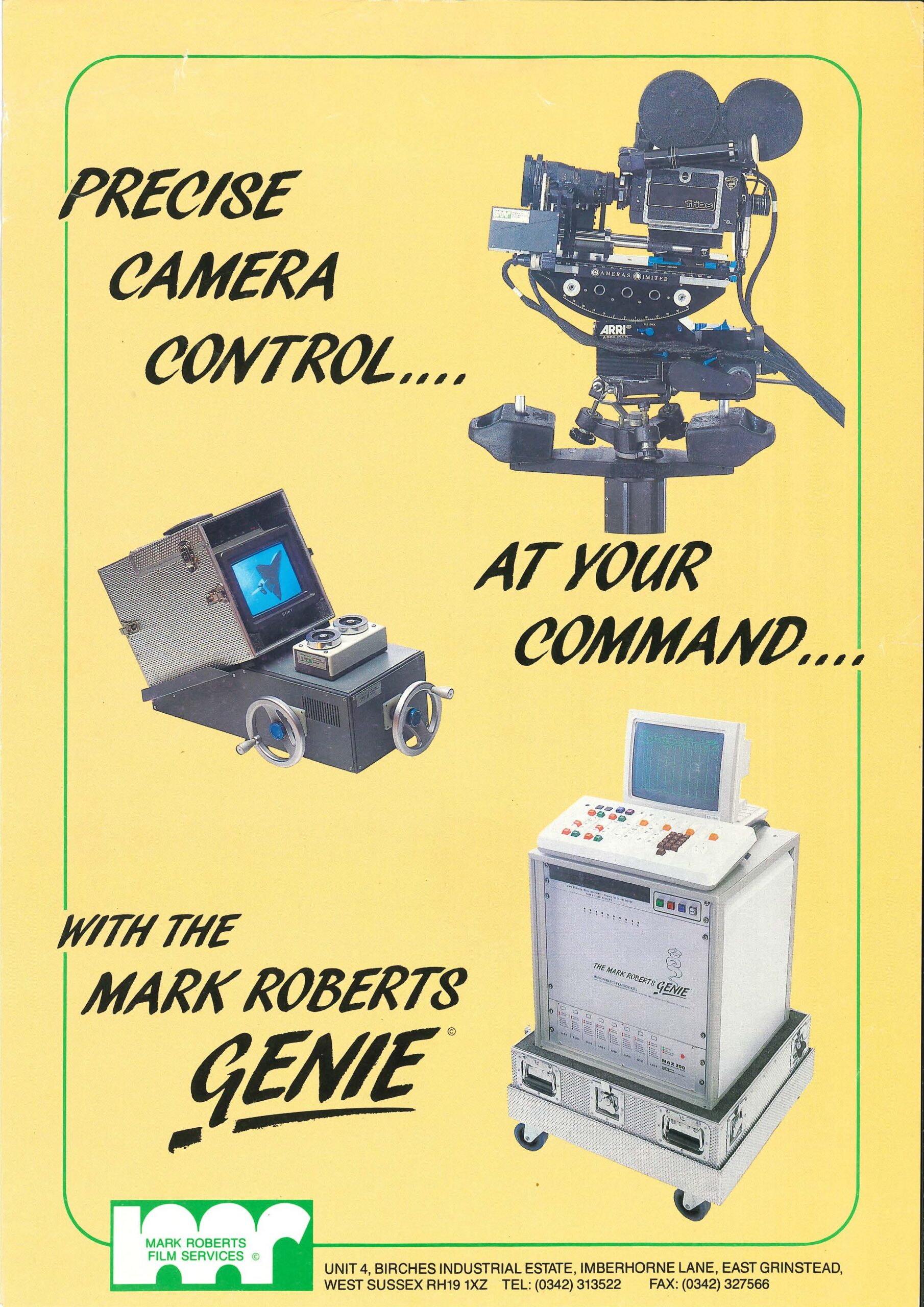 The release of Star Wars in 1977 ignited global demand for motion control technology. Filmmakers needed accuracy, repeatability, and camera movement that felt alive.Mark responded exactly the way he always had: by inventing. He engineered full motion control systems that delivered unprecedented stability and adaptability. As orders grew, the company moved into larger premises in 1985, enabling the production of floor‑mounted systems, overhead rigs, and custom Panther dollies, which were modified from manual dollies to fully robotic repeatable dollies, that set new performance standards. Among his most famous systems was the MRC4 and Genie, affectionately marketed as “The Motion Control System that grants your every wish!” These systems powered effects for films such as Santa Claus, Aliens, Batman, countless TV shows, commercials, and music videos.